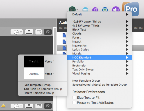 Show pagesource Old revisions Backlinks Export to PDF Lyric Template Tutorial How to import and apply the 'NCC Standard' lyric template in ProPresenter 6 Import Lyric Templates Double Click on Lyric Template Media Folder> ProPresenter Lyric Files> Lyric_Template_NCC_Standard Apply Template Select slide(s) you want to apply a template to Go to the “Template” icon on the top toolbar (or right click on the slide) Go to “NCC Standard” → Either Black or White as needed Table of Contents Lyric Template Tutorial Import Lyric Templates Apply Template